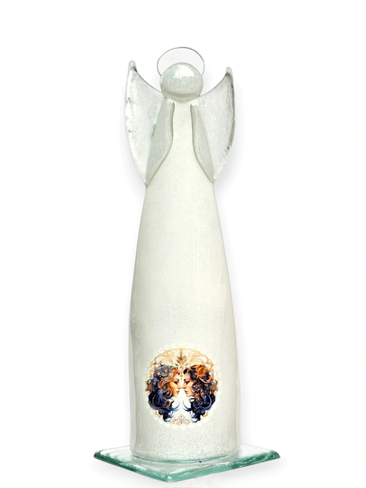 Tento skleněný anděl je vysoký přibližně 25 cm a jeho základna má rozměry 9 x 9 cm. Anděl je dekorován motivem Blíženců na bílém podkladu.