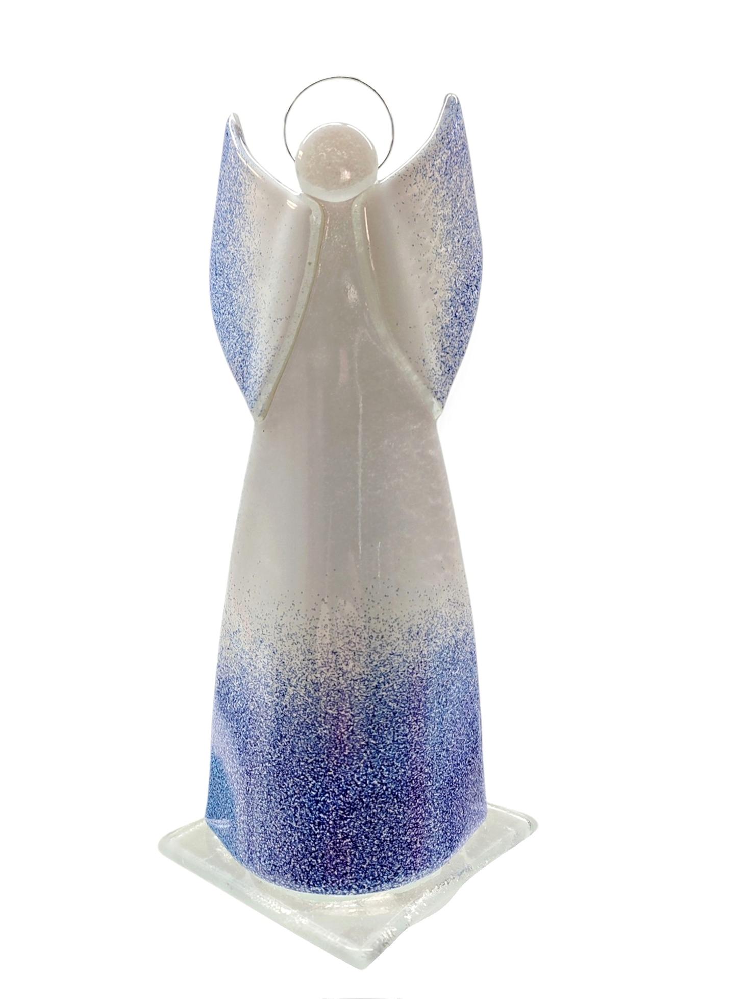 Tento skleněný anděl je vysoký přibližně 25 cm a jeho základ má rozměry 9 x 9 cm . Anděl je dekorován modrou barvou na bílém podkladu.